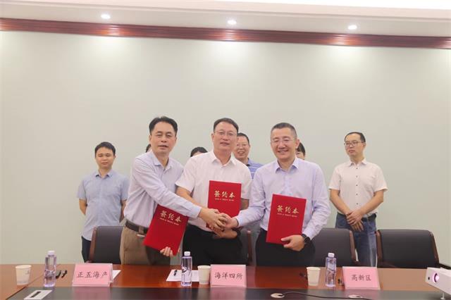 海洋四所紀委書記周雄,高新區黨工委書記、管委會主任梁小雄,正五海產公司副總經理上官云山出席儀式并簽署合作協議。